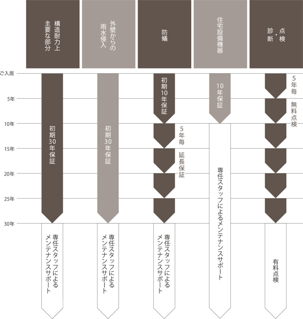建物の基礎や柱・梁など、主要構造部分について初期30年保証制度を設けています。 - 設備機器10年長期保証