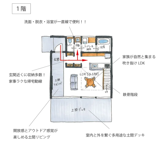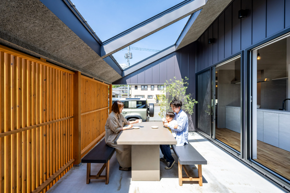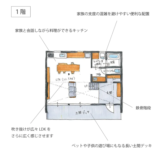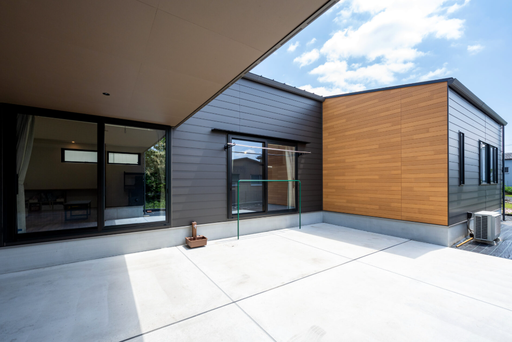 広々としたリビングには大きな吹き抜けを採用し、より開放的な空間を実現。2階には、ライフスタイルの変化に対応できる部屋を設け、プライバシーを保ちながらも、家全体に一体感を持たせた設計となっています。広い土間デッキは、ペットや子供の遊び場や趣味のスペースとして活用できます。