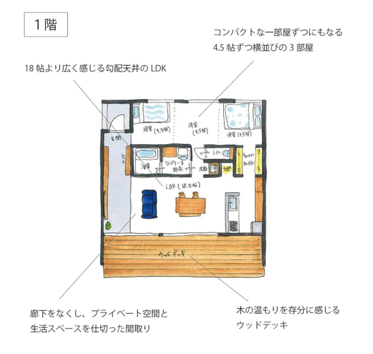 廊下をなくし、家の中心に水まわりを配置することで、LDKとプライベート空間を仕切った設計です。リビングには広さを感じさせる勾配天井と土間を採用。プライベート空間には、4.5畳のコンパクトな部屋を3つ設けられます。