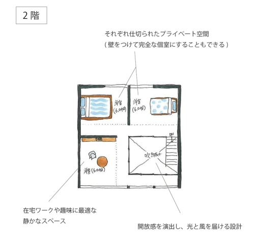 LDKには吹き抜けを採用し、光をたっぷり取り込める明るく開放的な空間を実現。水まわりを一直線に配置し、家事動線にも配慮した設計となっています。2階は、書斎や趣味のスペースとして活用できるほか、壁を設置することでプライベートと空間としても使用できます。
