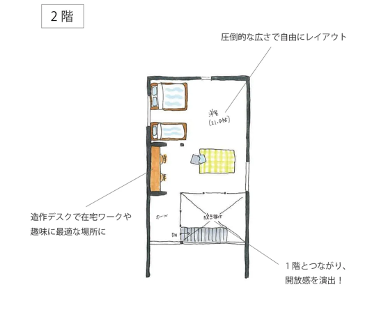 LDKには吹き抜けを採用し、光をたっぷり取り込める明るく開放的な空間を実現。水まわりを一直線に配置し、家事動線にも配慮した設計となっています。2階は、書斎や趣味のスペースとして活用できるほか、壁を設置することでプライベートと空間としても使用できます。
