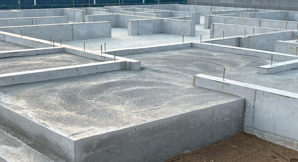 建物全体を面で支える構造。地盤の揺れを分散し、不同沈下に強いのが特徴です。一般的な120mmより厚い立ち上がり幅150mmの基礎を採用し、建物全体をしっかり支える安定した構造を実現。また、鉄筋を150mm間隔で配筋することで基礎全体の強度を高め、地震に強い住まいを実現しています。