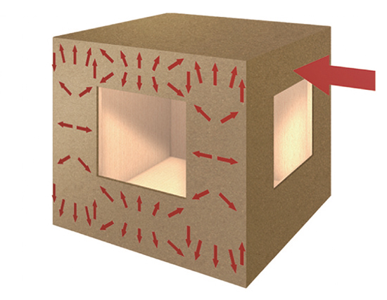 微細な繊維の間に空気を多く含み、優れた断熱性と耐火性を発揮する素材です。法定不燃材料として認められており、燃えにくく、溶けにくく、高温下でも形状を保ちやすいのが特徴。火災時にも裏面が熱くなりにくく、煙の発生が少ないため、延焼を抑え、室内の安全を守ります。
