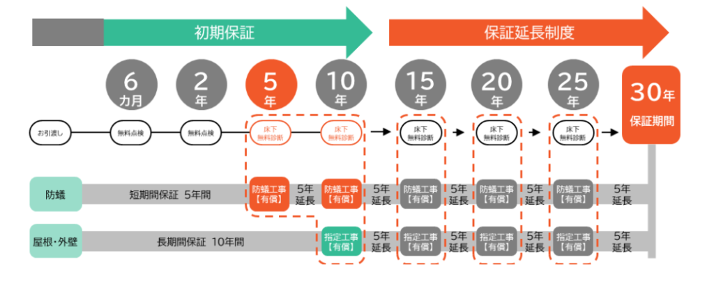 住宅瑕疵担保責任保険(10年)に加え、有償メンテナンスプランを利用すれば、最長30年まで保証を延長することが可能。