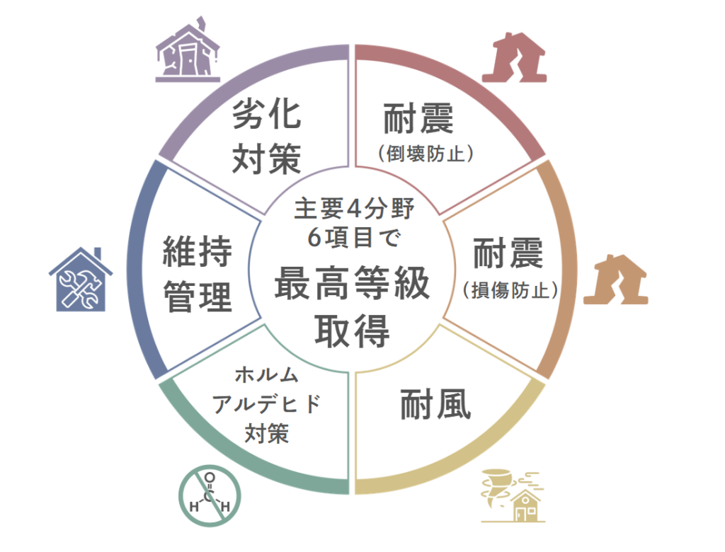 国が定める「長期優良住宅」の基準をクリアすることはもちろん、「住宅性能表示制度」を全棟で採用しています。
