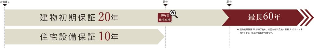 • 建物保証:初期20年(10年目に第三者点検あり)、最長60年まで延長可能
