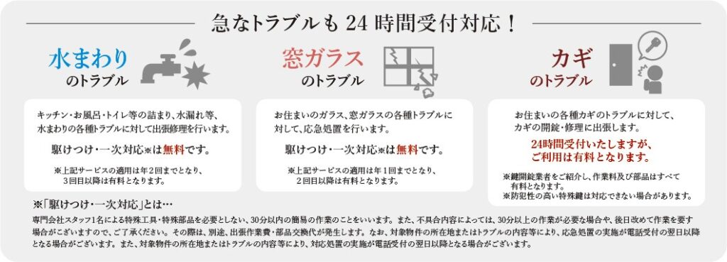 • トラブル対応:水まわりやガラス、鍵のトラブルを24時間受付