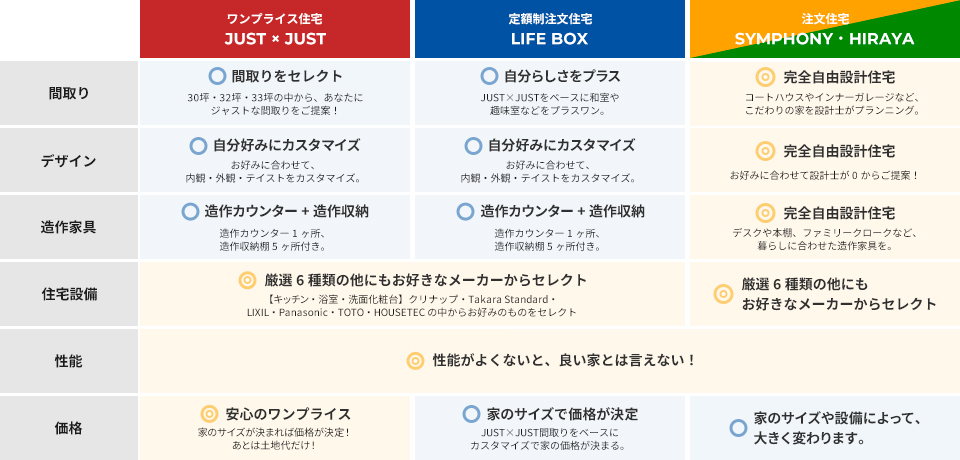 • 商品ラインナップはワンプライス住宅の「JUST×JUST」、完全注文住宅の「SYMPHONYなど多彩