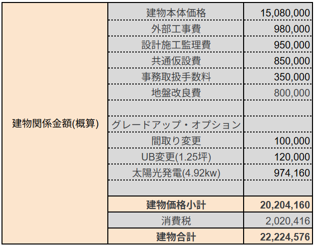 建物価格に建物の諸経費、銀行諸経費を合わせた金額は25,924,576円で約2,590万円。