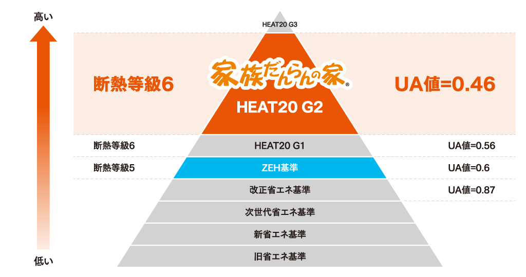 「家族だんらんの家」は断熱等級6や耐震等級2以上を標準仕様とし、ZEH基準・長期優良住宅に対応しています。