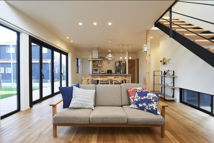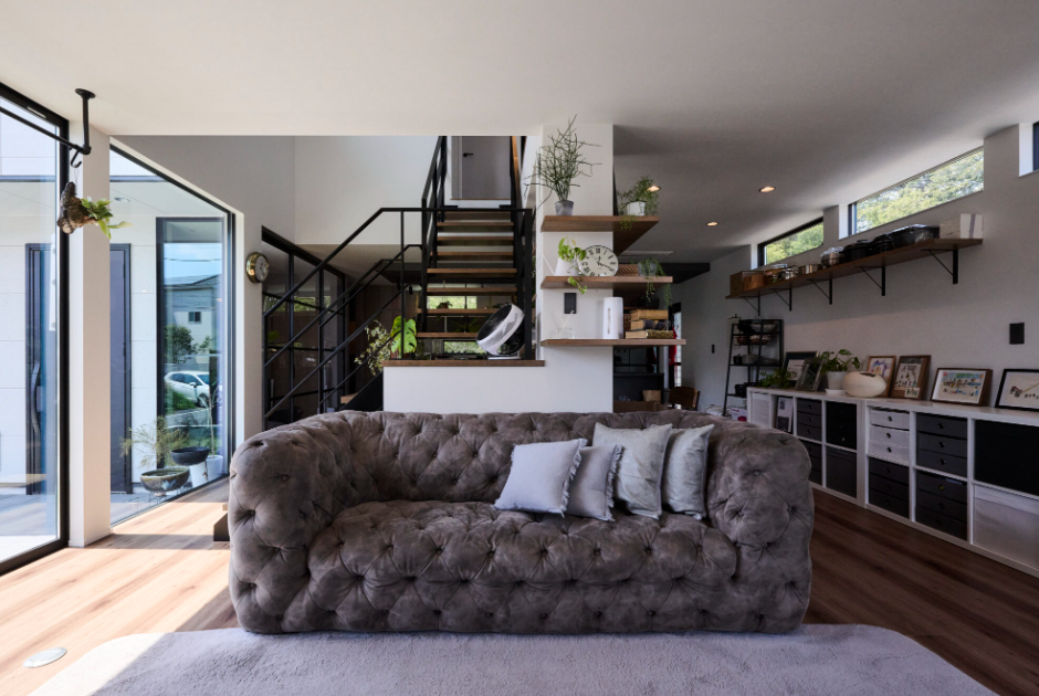 リビングから庭につながる大きな窓が印象的な箱型住宅。階段は形状や配置、手すりの素材などにこだわり、建物の真ん中に設置することでゆるやかに空間をつなぎ、自然と家族のコミュニケーションが生まれる設計となっています。