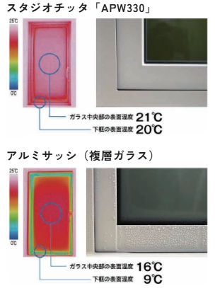 スタジオ・チッタが標準採用している「APW330」と一般的なアルミサッシでは、表面温度に約10℃の差があり、冬は暖かく夏は涼しい、一年を通して快適な家づくりが実現します。