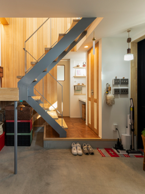 間口3mの狭小住宅。大きな土間を備えた玄関から続く階段スペースに、目線が上に向かうリブパネルを採用し、奥行きと高さを意識した設計になっています。