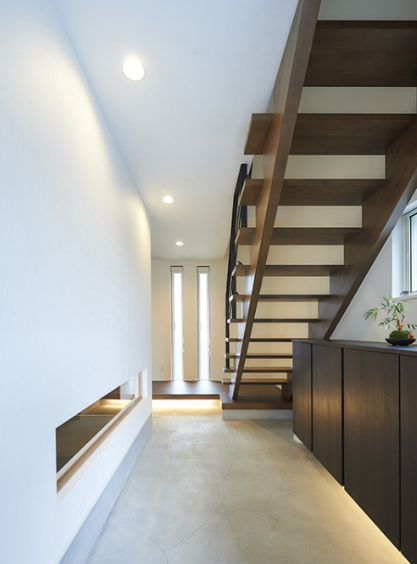 敷地面積20坪ほどの狭小住宅。土間に奥行きを持たせ、木製スケルトン階段を設けることで、視線の抜けを意識した広がりのある空間を生み出しています。無駄を省いたシンプルな設計により、コストを抑えた住宅となっています。