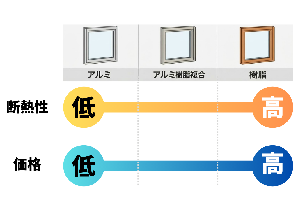 | サッシの種類 | 価格 | 断熱性 | 結露のしにくさ |